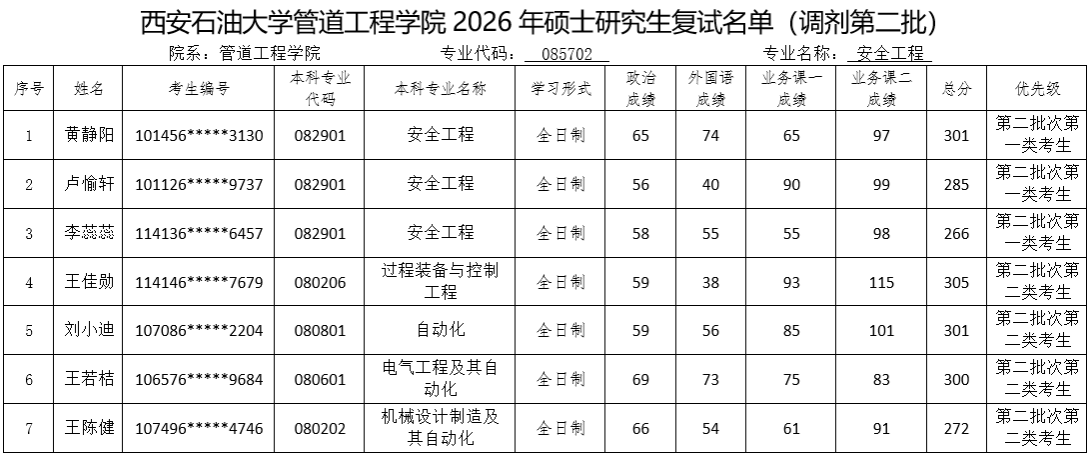 现将管道工程学院参加复试考生名单(调剂第二批)予以公布,请各位考生按照要求准时参加复试。如考生对复试名单有异议,请与我院办公室联系。